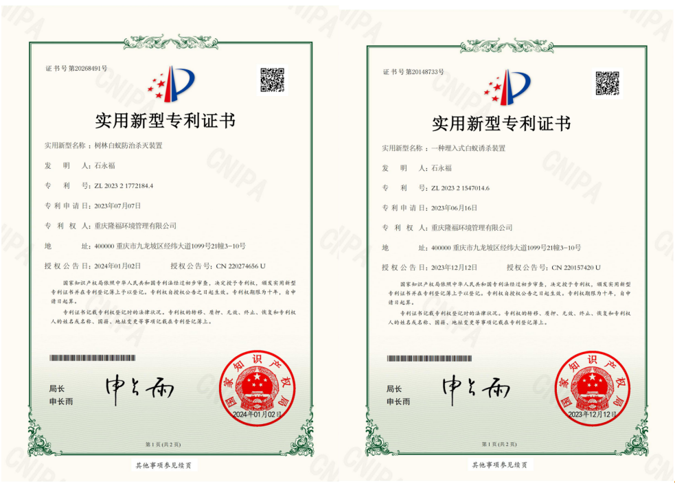 我司是全國白蟻防治標準化建設和實施的試點單位、是率先獲得“全國白蟻防治(高級)專業服務能力單位”、全國白蟻防治中心委員單位、堤壩白蟻防治標準流程化施工的創始單位、川渝地區首家開展白蟻防治技術培訓的教學單位、重慶市白蟻專委會理事單位、有害生物防治A級單位。